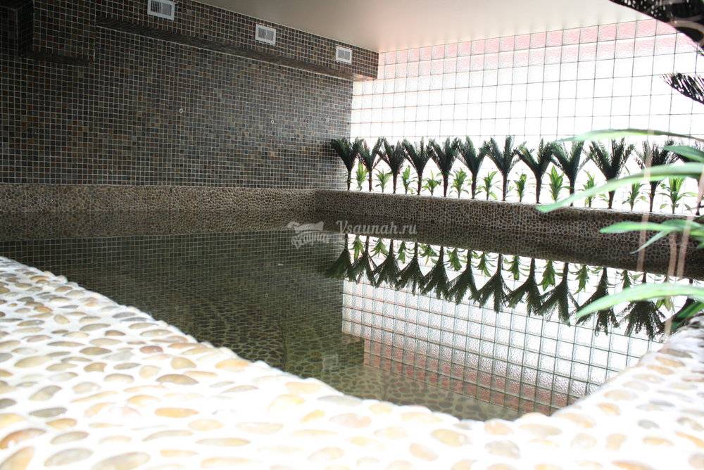 Мужское и женское отделения вместимостью до 100 человек. В каждом отделение по два бассейна с холодной и теплой водой, в теплых бассейнах установлены гидромассажные ванны. У мужчин – большая финская парная, турецкая сауна (хамам), русская баня на дровах. У женщин, в дополнении к выше перечисленному - инфракрасная сауна и отдельная комната с коллагеновым солярием.